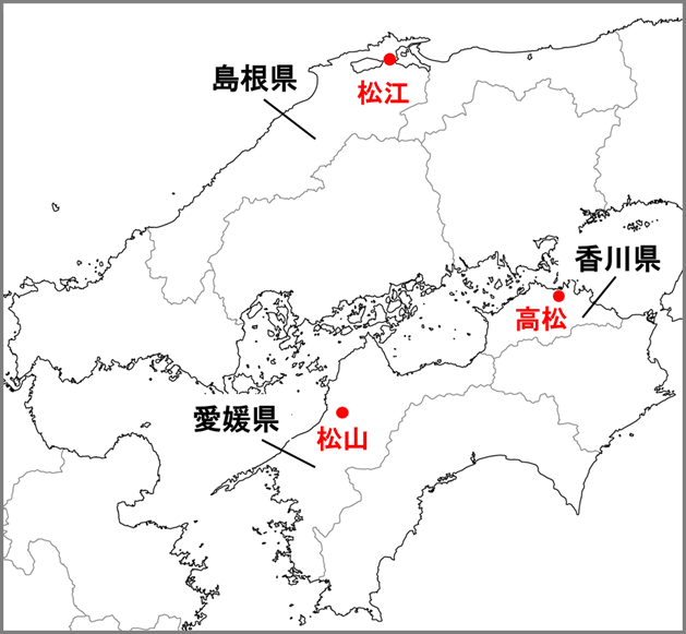 県名と県庁所在地が異なる都市が載っている中国・四国地方の地図