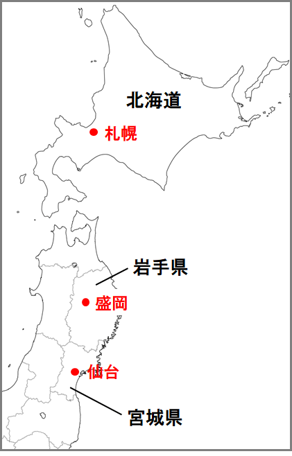 道県名と道県庁所在地が異なる都市が載っている北海道・東北地方の地図